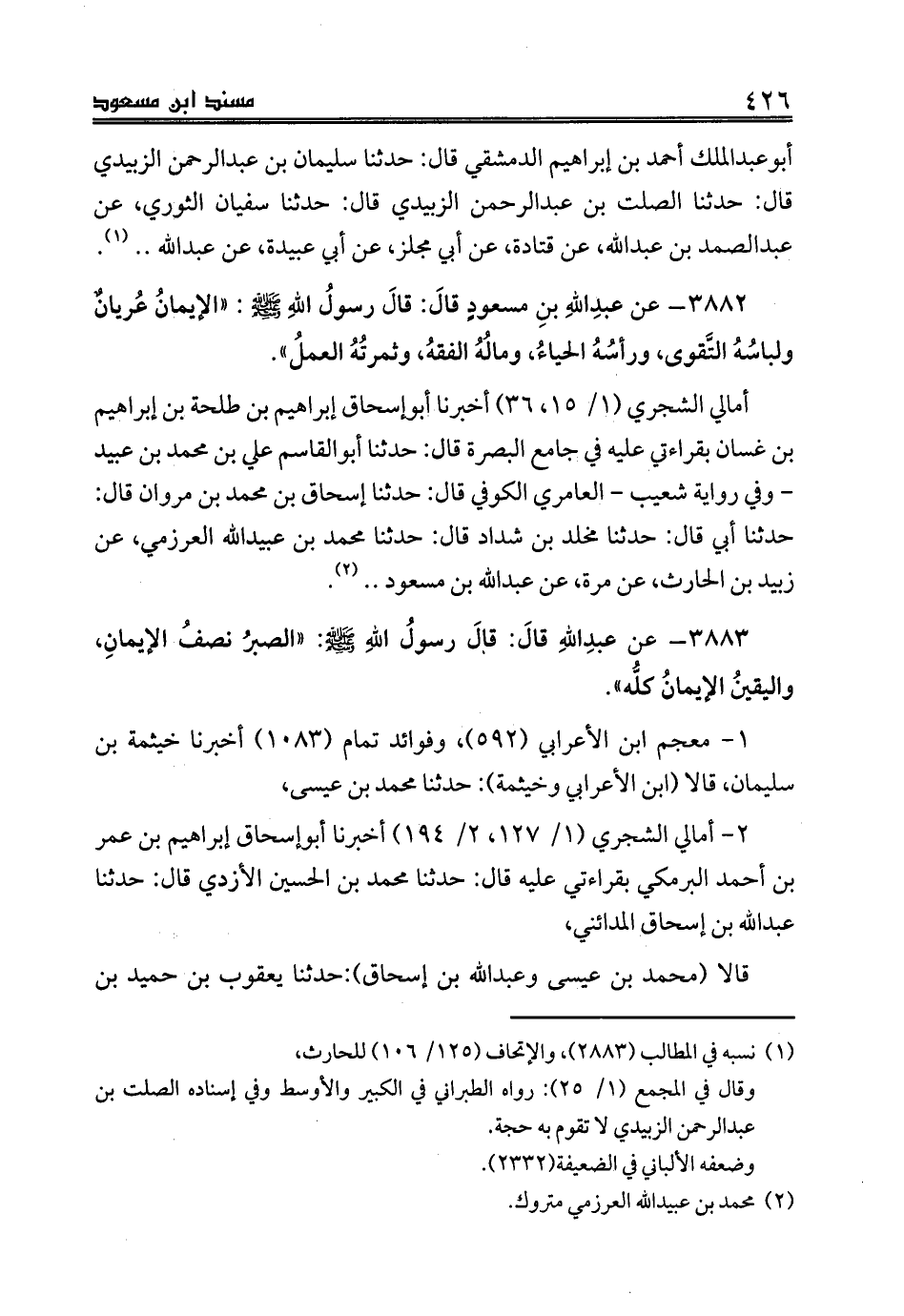 3883 - عن عبدِاللهِ قالَ: قالَ رسولُ اللهِ صلى الله عليه وسلم: «الصبرُ نصفُ الإيمانِ، واليقينُ الإيمانُ كلُّه».