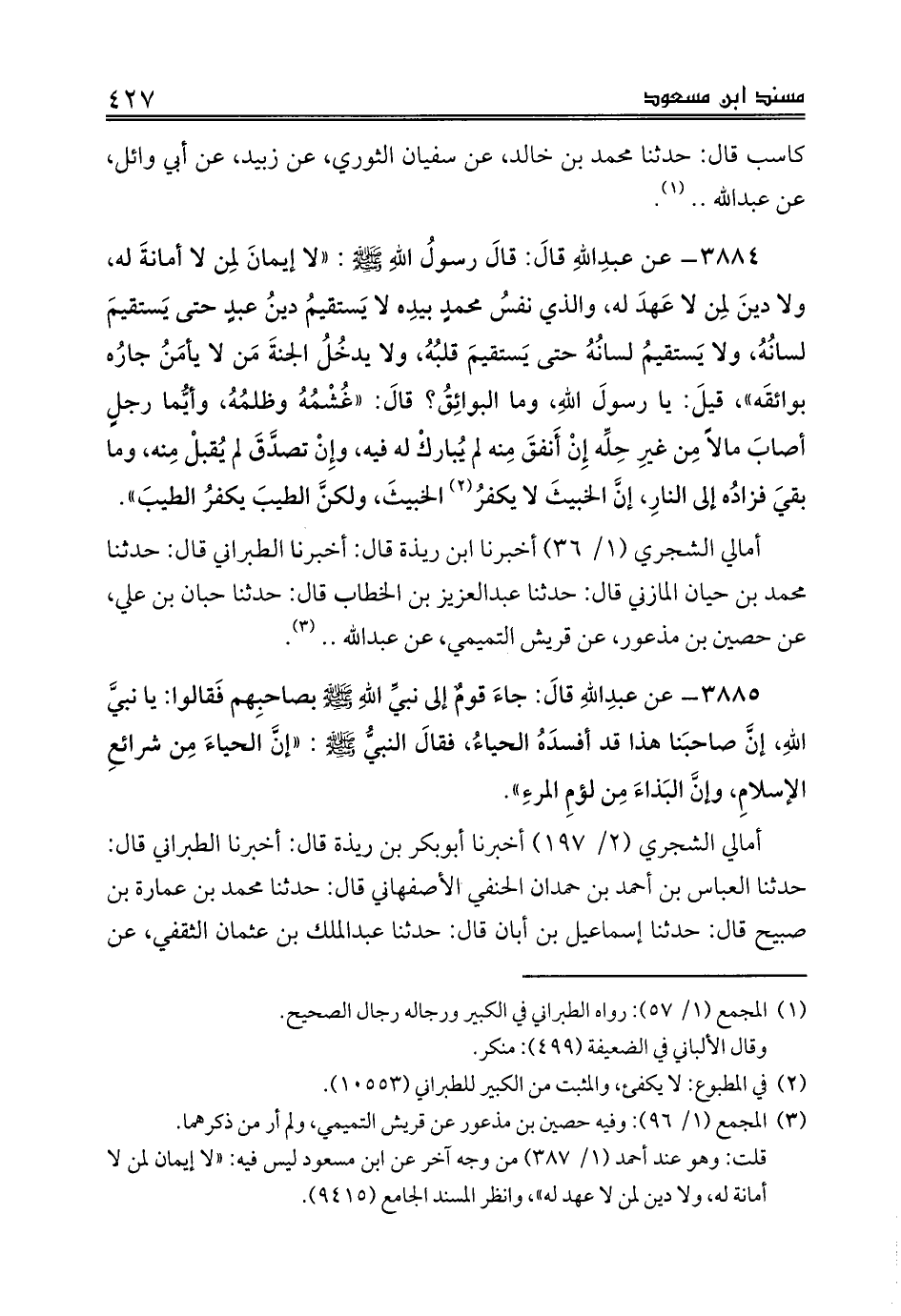 3884 - عن عبدِاللهِ قالَ: قالَ رسولُ اللهِ صلى الله عليه وسلم: «لا إيمانَ لِمن لا أمانةَ له، ولا دينَ لِمن لا عَهدَ له، والذي نفسُ محمدٍ بيدِه لا يَستقيمُ دينُ عبدٍ حتى يَستقيمُ لسانُهُ، ولا يَستقيمُ لسانُهُ حتى يَستقيمُ قلبُهُ، ولا يدخُلُ الجنةَ مَن لا يأمَنُ جارُه بوائقَه»، قيلَ: يا رسولَ اللهِ، وما البوائِقُ؟ قالَ: «غُشْمُهُ وظلمُهُ، وأيُّما رجلٍ أصابَ مالاً مِن غيرِ حِلِّه إِنْ أَنفقَ مِنه لم يُباركْ له فيه، وإِنْ تصدَّقَ لم يُقبلْ مِنه، وما بقيَ فزادُه إلى النارِ، إنَّ الخبيثَ لا يكفرُ (¬2) الخبيثَ، ولكنَّ الطيبَ يكفرُ الطيبَ».
