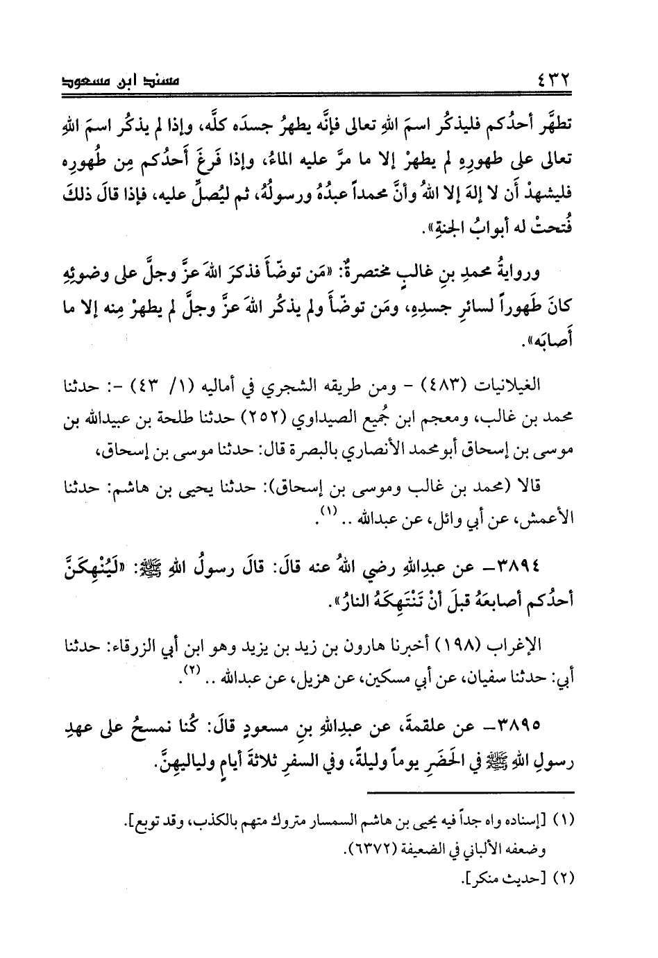 وروايةُ محمدِ بنِ غالبٍ مختصرةٌ: «مَن توضّأَ فذكرَ اللهَ عزَّ وجلَّ على وضوئِهِ كانَ طَهوراً لسائرِ جسدِهِ، ومَن توضّأَ ولم يذكُر اللهَ عزَّ وجلَّ لم يطهرْ مِنه إلا ما أَصابَه».