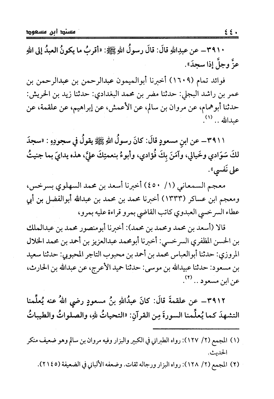 فوائد تمام (1609) أخبرنا أبوالميمون عبدالرحمن بن عبدالرحمن بن عمر بن راشد البجلي: حدثنا مضر بن محمد البغدادي: حدثنا زيد بن الحريش: حدثنا أبوهمام، عن مروان بن سالم، عن الأعمش، عن إبراهيم، عن علقمة، عن عبدالله .. (¬1).