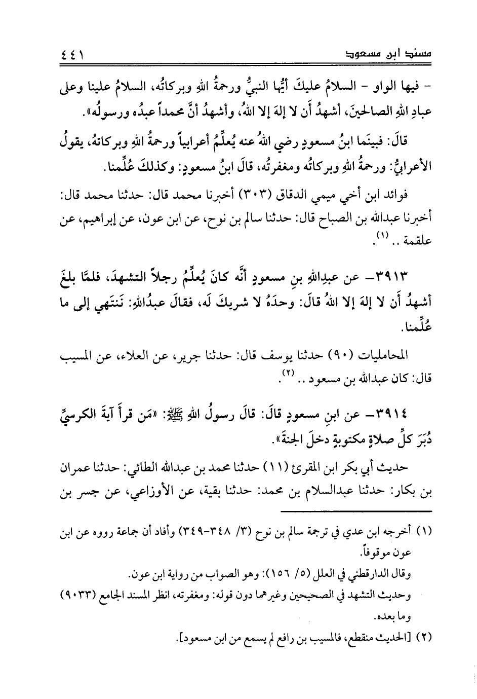 المحامليات (90) حدثنا يوسف قال: حدثنا جرير، عن العلاء، عن المسيب قال: كان عبدالله بن مسعود .. (¬2).
