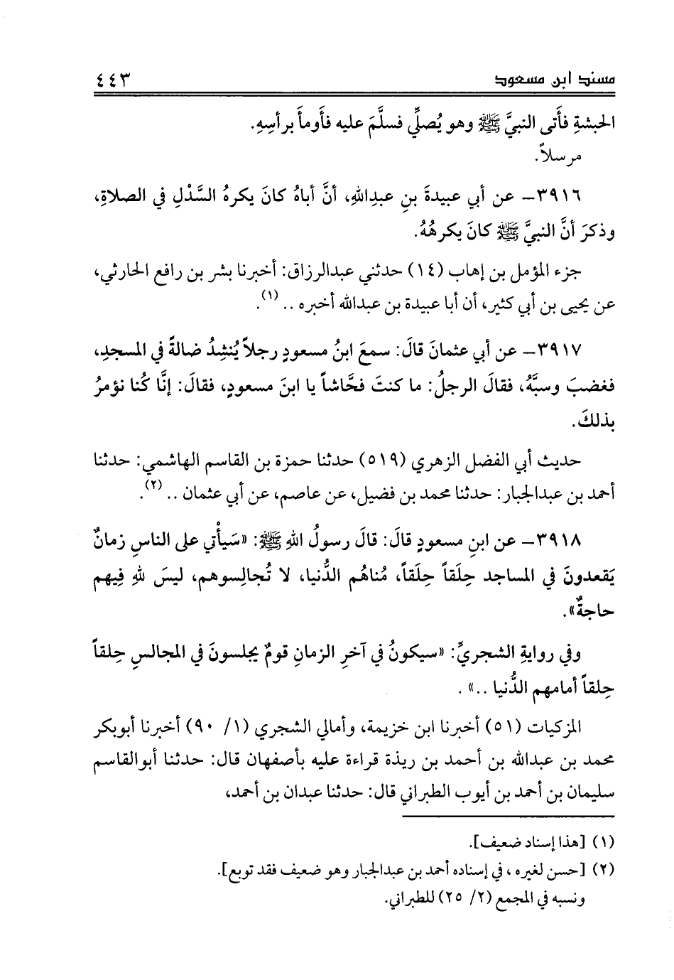 3918 - عن ابنِ مسعودٍ قالَ: قالَ رسولُ اللهِ صلى الله عليه وسلم: «سَيأْتي على الناسِ زمانٌ يَقعدونَ في المساجد حِلَقاً حِلَقاً، مُناهُم الدُّنيا، لا تُجالِسوهم، ليسَ للهِ فِيهم حاجةٌ».