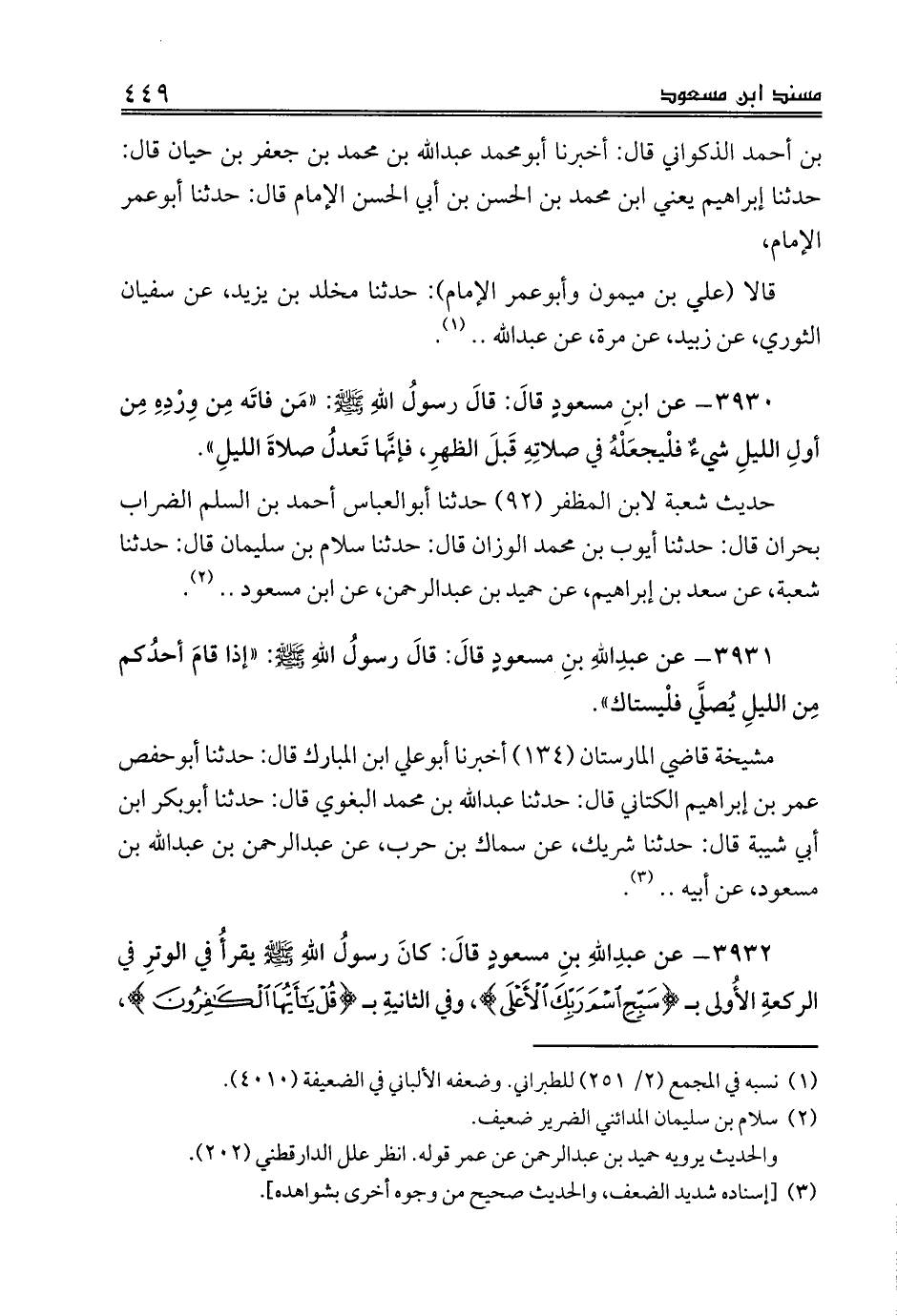 3932 - عن عبدِاللهِ بنِ مسعودٍ قالَ: كانَ رسولُ اللهِ صلى الله عليه وسلم يقرأُ في الوترِ في الركعةِ الأُولى بـ {سَبِّحِ اسْمَ رَبِّكَ الْأَعْلَى}، وفي الثانيةِ بـ {قُلْ يَاأَيُّهَا الْكَافِرُونَ}،