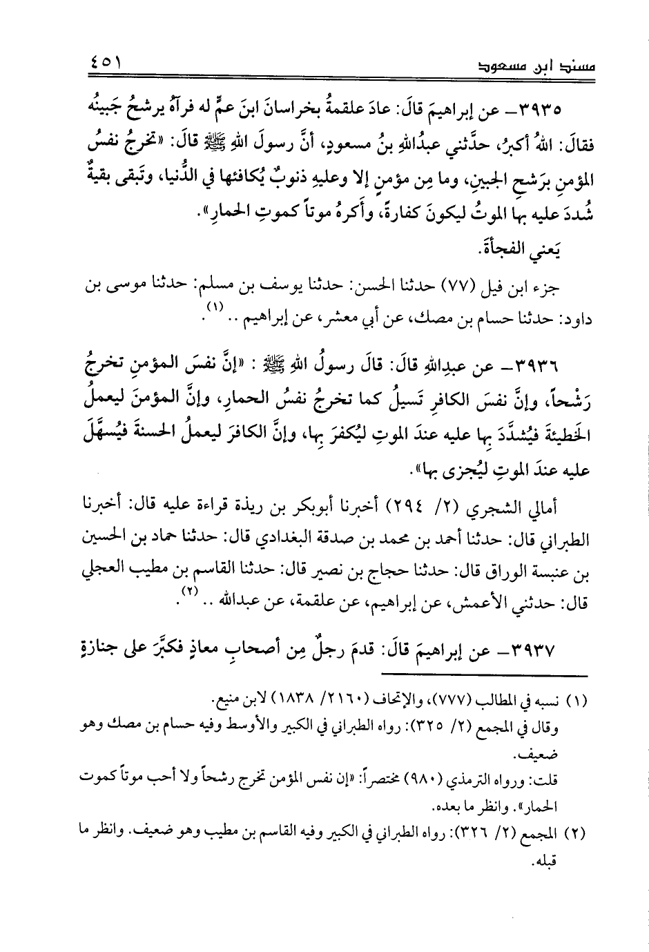 3935 - عن إبراهيمَ قالَ: عادَ علقمةُ بخراسانَ ابنَ عمٍّ له فرآهُ يرشحُ جَبينُه فقالَ: اللهُ أكبرُ، حدَّثني عبدُاللهِ بنُ مسعودٍ، أنَّ رسولَ اللهِ صلى الله عليه وسلم قالَ: «تخرجُ نفسُ المؤمنِ برَشحِ الجبينِ، وما مِن مؤمنٍ إلا وعليهِ ذنوبٌ يُكافئها في الدُّنيا، وتَبقى بقيةٌ شُددَ عليه بها الموتُ ليكونَ كفارةً، وأَكرهُ موتاً كموتِ الحمارِ».