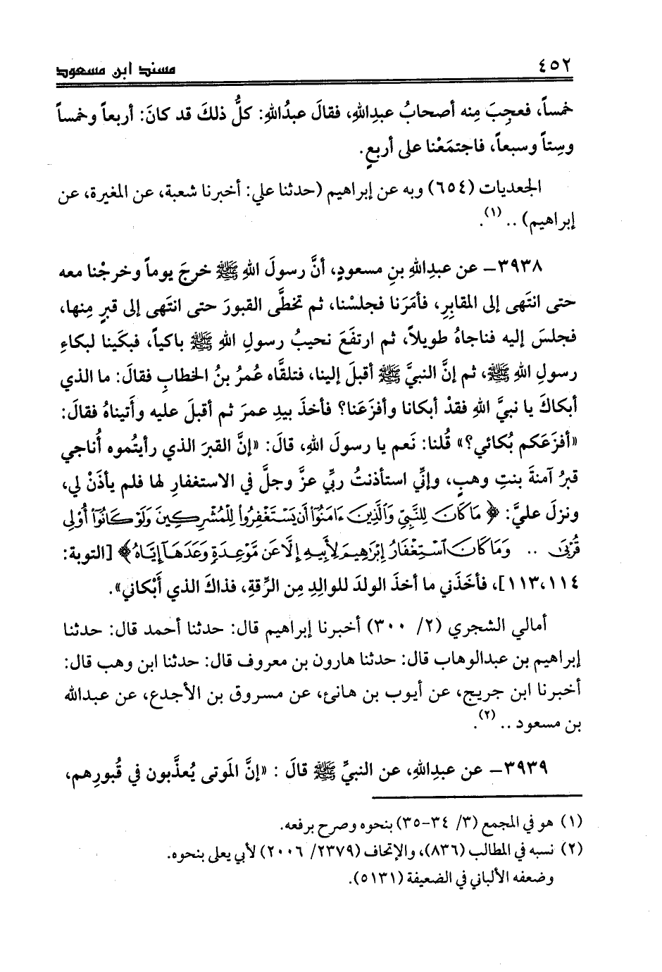 3938 - عن عبدِاللهِ بنِ مسعودٍ، أنَّ رسولَ اللهِ صلى الله عليه وسلم خرجَ يوماً وخرجْنا معه حتى انتَهى إلى المقابِرِ، فأمَرَنا فجلسْنا، ثم تخطَّى القبورَ حتى انتَهى إلى قبرٍ مِنها، فجلسَ إليه فناجاهُ طويلاً، ثم ارتفَعَ نحيبُ رسولِ اللهِ صلى الله عليه وسلم باكياً، فبكَينا لبكاءِ رسولِ اللهِ صلى الله عليه وسلم، ثم إنَّ النبيَّ صلى الله عليه وسلم أقبلَ إلينا، فتلقَّاه عُمرُ بنُ الخطابِ فقالَ: ما الذي أبكاكَ يا نبيَّ اللهِ فقدْ أبكانا وأفزَعَنا؟ فأخذَ بيدِ عمرَ ثم أقبلَ عليه وأَتيناهُ فقالَ: «أفزَعَكم بُكائي؟» قُلنا: نَعم يا رسولَ اللهِ، قالَ: «إنَّ القبرَ الذي رأيتُموه أُناجي قبرُ آمنةَ بنتِ وهبٍ، وإنِّي استأذنتُ ربِّي عزَّ وجلَّ في الاستغفارِ لها فلم يأذَنْ لي، ونزلَ عليَّ: {مَا كَانَ لِلنَّبِيِّ وَالَّذِينَ آمَنُوا أَنْ يَسْتَغْفِرُوا لِلْمُشْرِكِينَ وَلَوْ كَانُوا أُولِي قُرْبَى .. وَمَا كَانَ اسْتِغْفَارُ إِبْرَاهِيمَ لِأَبِيهِ إِلَّا عَنْ مَوْعِدَةٍ وَعَدَهَا إِيَّاهُ} [التوبة: 113،114]، فأخَذَني ما أخذَ الولدَ للوالِدِ مِن الرِّقةِ، فذاكَ الذي أَبْكاني».