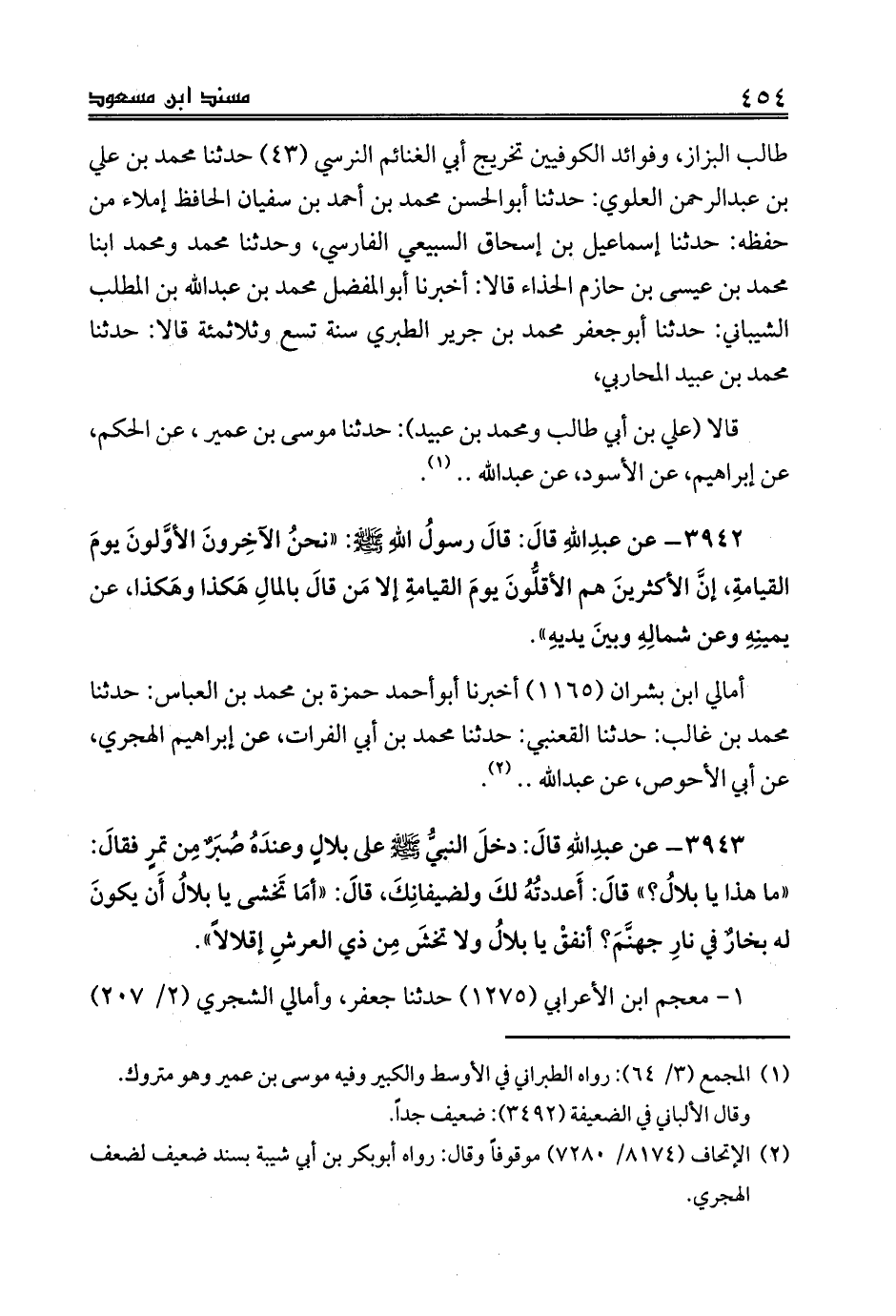 طالب البزاز، وفوائد الكوفيين تخريج أبي الغنائم النرسي (43) حدثنا محمد بن علي بن عبدالرحمن العلوي: حدثنا أبوالحسن محمد بن أحمد بن سفيان الحافظ إملاء من حفظه: حدثنا إسماعيل بن إسحاق السبيعي الفارسي، وحدثنا محمد ومحمد ابنا محمد بن عيسى بن حازم الحذاء قالا: أخبرنا أبوالمفضل محمد بن عبدالله بن المطلب الشيباني: حدثنا أبوجعفر محمد بن جرير الطبري سنة تسع وثلاثمئة قالا: حدثنا محمد بن عبيد المحاربي،
