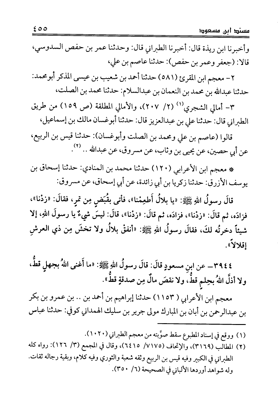 3944 - عن ابنِ مسعودٍ قالَ: قالَ رسولُ اللهِ صلى الله عليه وسلم: «ما أَغنى اللهُ بجهلٍ قطُّ، ولا أذلَّ اللهُ بحِلمٍ قطُّ، ولا نقصَ مالٌ مِن صدقةٍ قطُّ».