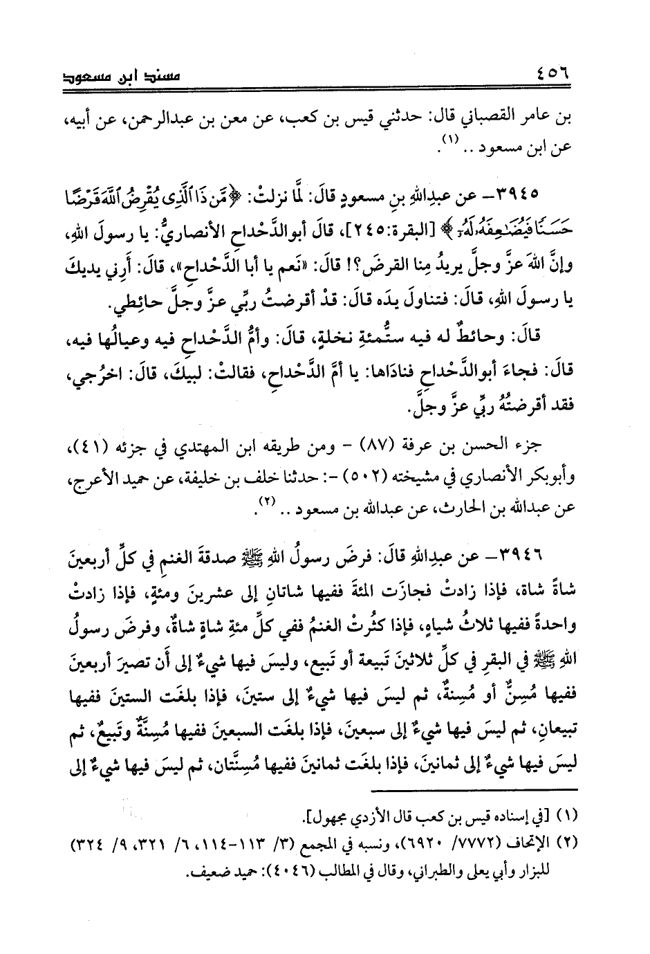 3945 - عن عبدِاللهِ بنِ مسعودٍ قالَ: لمَّا نزلتْ: {مَنْ ذَا الَّذِي يُقْرِضُ اللَّهَ قَرْضًا حَسَنًا فَيُضَاعِفَهُ لَهُ} [البقرة:245]، قالَ أبوالدَّحْداحِ الأنصاريُّ: يا رسولَ اللهِ، وإنَّ اللهَ عزَّ وجلَّ يريدُ مِنا القرضَ؟! قالَ: «نَعم يا أبا الدَّحْداحِ»، قالَ: أَرِني يديكَ يا رسولَ اللهِ، قالَ: فتناولَ يدَه قالَ: قدْ أقرضتُ ربِّي عزَّ وجلَّ حائِطي.
