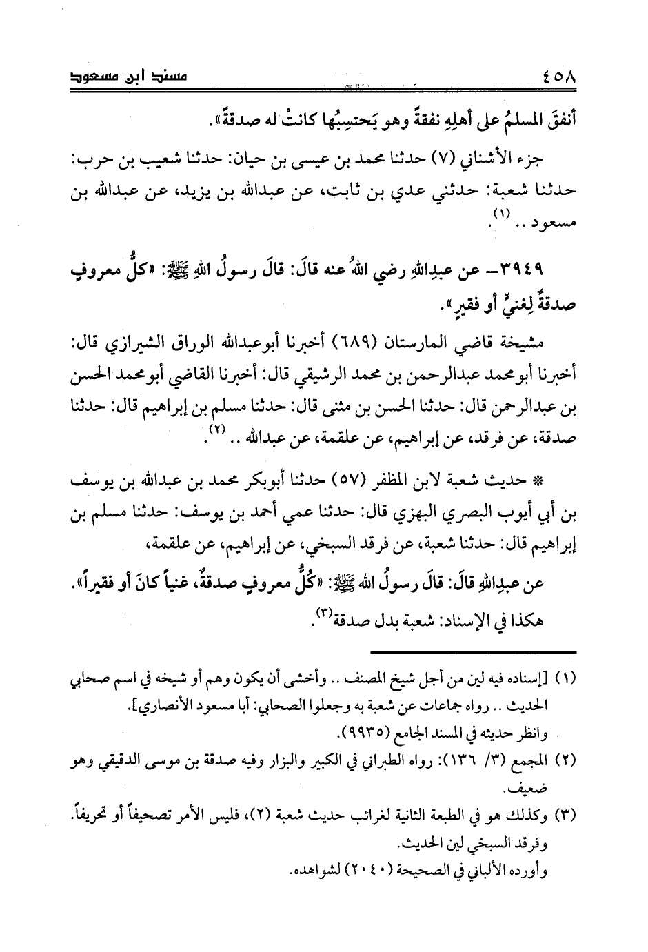 جزء الأشناني (7) حدثنا محمد بن عيسى بن حيان: حدثنا شعيب بن حرب: حدثنا شعبة: حدثني عدي بن ثابت، عن عبدالله بن يزيد، عن عبدالله بن مسعود .. (¬1).
