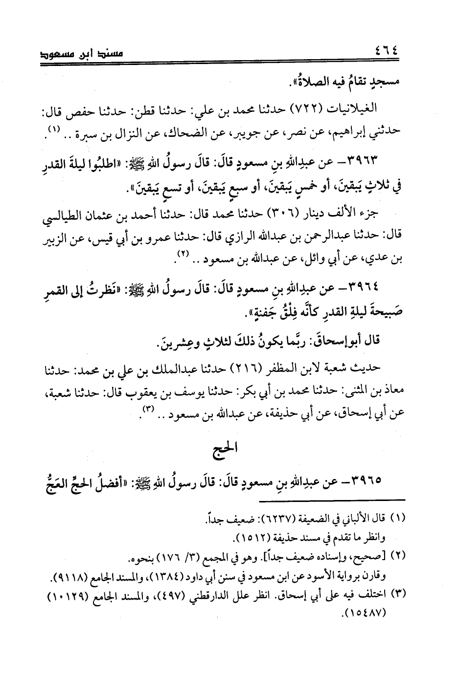 3965 - عن عبدِاللهِ بنِ مسعودٍ قالَ: قالَ رسولُ اللهِ صلى الله عليه وسلم: «أفضلُ الحجِّ العَجُّ