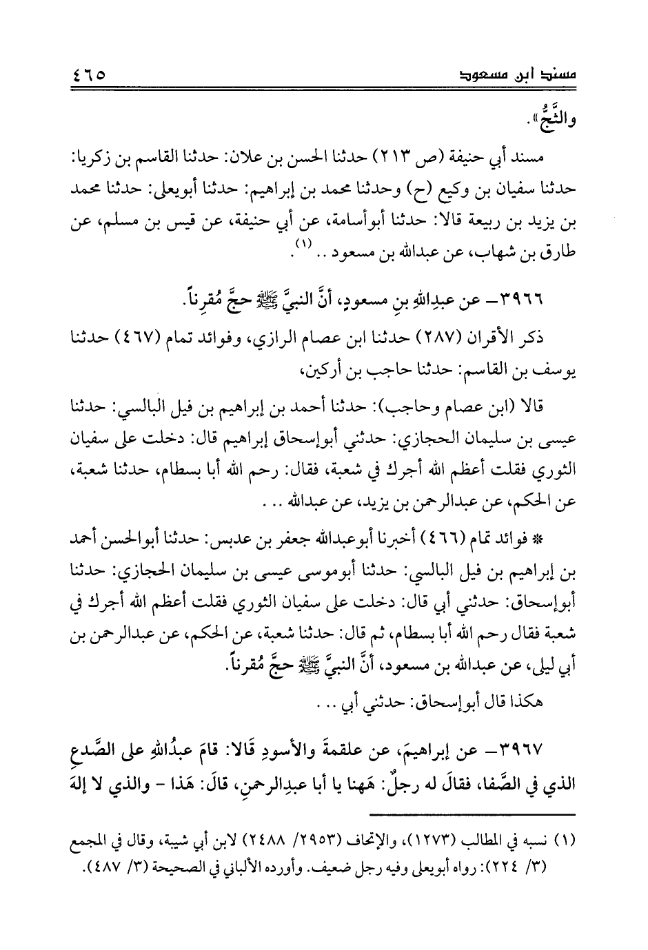 * فوائد تمام (466) أخبرنا أبوعبدالله جعفر بن عدبس: حدثنا أبوالحسن أحمد بن إبراهيم بن فيل البالسي: حدثنا أبوموسى عيسى بن سليمان الحجازي: حدثنا أبوإسحاق: حدثني أبي قال: دخلت على سفيان الثوري فقلت أعظم الله أجرك في شعبة فقال رحم الله أبا بسطام، ثم قال: حدثنا شعبة، عن الحكم، عن عبدالرحمن بن أبي ليلى، عن عبدالله بن مسعود، أنَّ النبيَّ صلى الله عليه وسلم حجَّ مُقرناً.