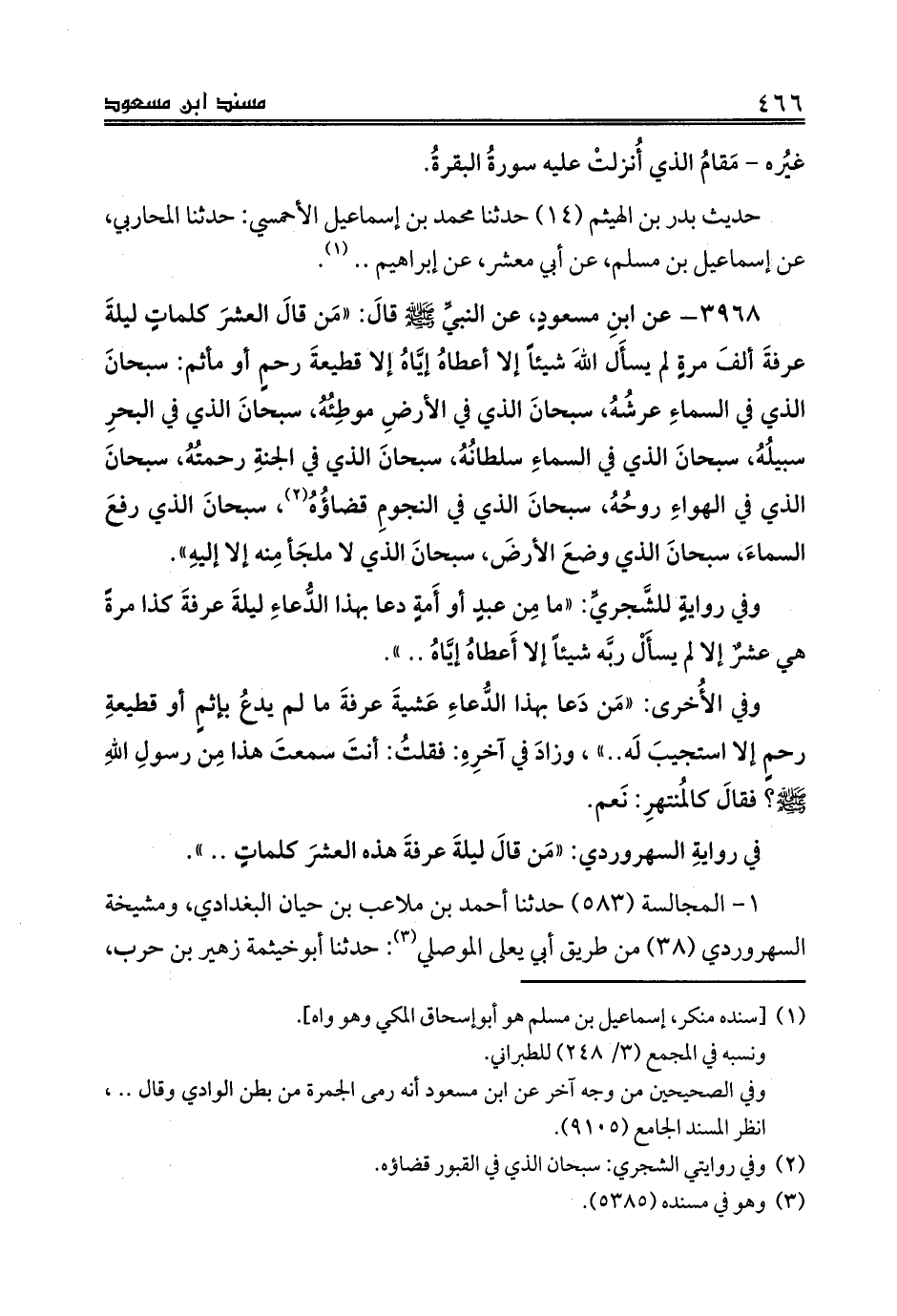 3968 - عن ابنِ مسعودٍ، عن النبيِّ صلى الله عليه وسلم قالَ: «مَن قالَ العشرَ كلماتٍ ليلةَ عرفةَ ألفَ مرةٍ لم يسأَل اللهَ شيئاً إلا أعطاهُ إيَّاهُ إلا قطيعةَ رحمٍ أو مأثم: سبحانَ الذي في السماءِ عرشُهُ، سبحانَ الذي في الأرضِ موطِئُهُ، سبحانَ الذي في البحرِ سبيلُهُ، سبحانَ الذي في السماءِ سلطانُهُ، سبحانَ الذي في الجنةِ رحمتُهُ، سبحانَ الذي في الهواءِ روحُهُ، سبحانَ الذي في النجومِ قضاؤُهُ (¬2)، سبحانَ الذي رفعَ السماءَ، سبحانَ الذي وضعَ الأرضَ، سبحانَ الذي لا ملجَأ مِنه إلا إليهِ».