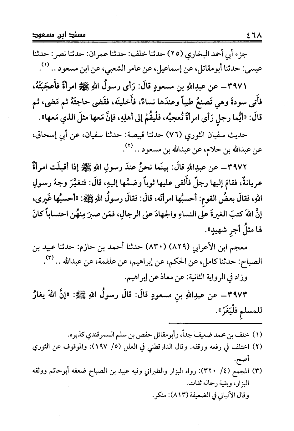 3973 - عن عبدِاللهِ بنِ مسعودٍ قالَ: قالَ رسولُ اللهِ صلى الله عليه وسلم: «إنَّ اللهَ يغارُ للمسلمِ فلْيَغَرْ».
