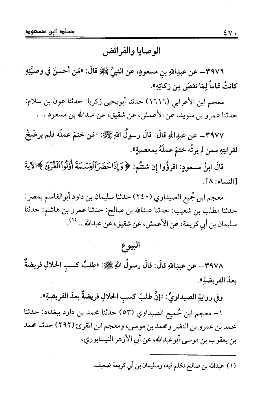 3976 - عن عبدِاللهِ بنِ مسعودٍ، عن النبيِّ صلى الله عليه وسلم قالَ: «مَن أحسنَ في وصيَّتِهِ كانتْ تماماً لِمَا نقصَ مِن زكاتِهِ».