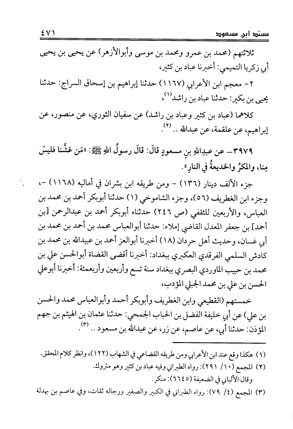 3979 - عن عبدِاللهِ بنِ مسعودٍ قالَ: قالَ رسولُ اللهِ صلى الله عليه وسلم: «مَن غشَّنا فليسَ مِنا، والمكرُ والخديعةُ في النارِ».
