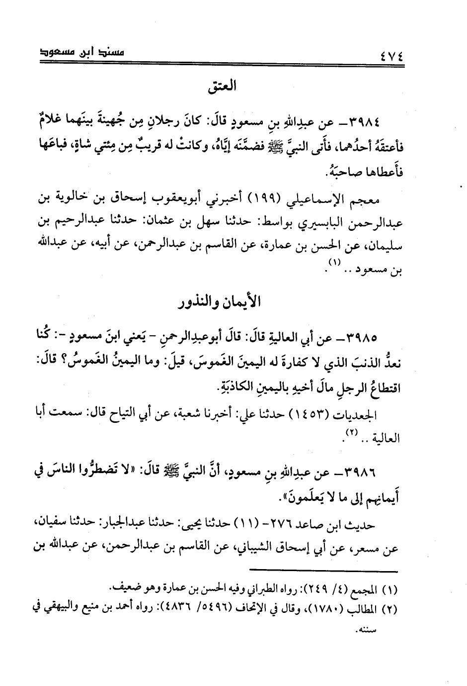3985 - عن أبي العاليةِ قالَ: قالَ أبوعبدِالرحمنِ - يَعني ابنَ مسعودٍ -: كُنا نعدُّ الذنبَ الذي لا كفارةَ له اليمينَ الغَموسَ، قيلَ: وما اليمينُ الغَموسُ؟ قالَ: اقتطاعُ الرجلِ مالَ أخيهِ باليمينِ الكاذبَةِ.