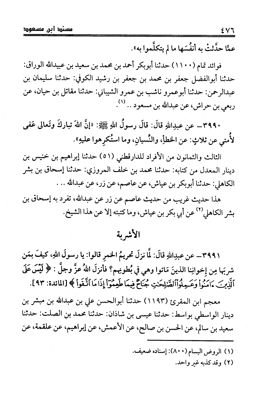 فوائد تمام (1100) حدثنا أبوبكر أحمد بن محمد بن سعيد بن عبيدالله الوراق: حدثنا أبوالفضل جعفر بن محمد بن جعفر بن رشيد الكوفي: حدثنا سليمان بن عبدالرحمن: حدثنا أبوعمرو ناشب بن عمرو الشيباني: حدثنا مقاتل بن حيان، عن ربعي بن حراش، عن عبدالله بن مسعود .. (¬1).