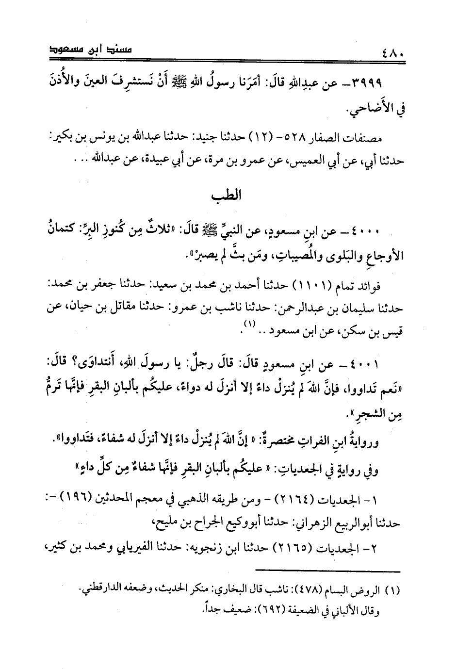 4001 - عن ابنِ مسعودٍ قالَ: قالَ رجلُ: يا رسولَ اللهِ، أَنتداوَى؟ قالَ: «نَعم تَداووا، فإنَّ اللهَ لم يُنزلْ داءً إلا أنزلَ له دواءً، عليكُم بألبانِ البقرِ فإنَّها تَرمُّ مِن الشجرِ».