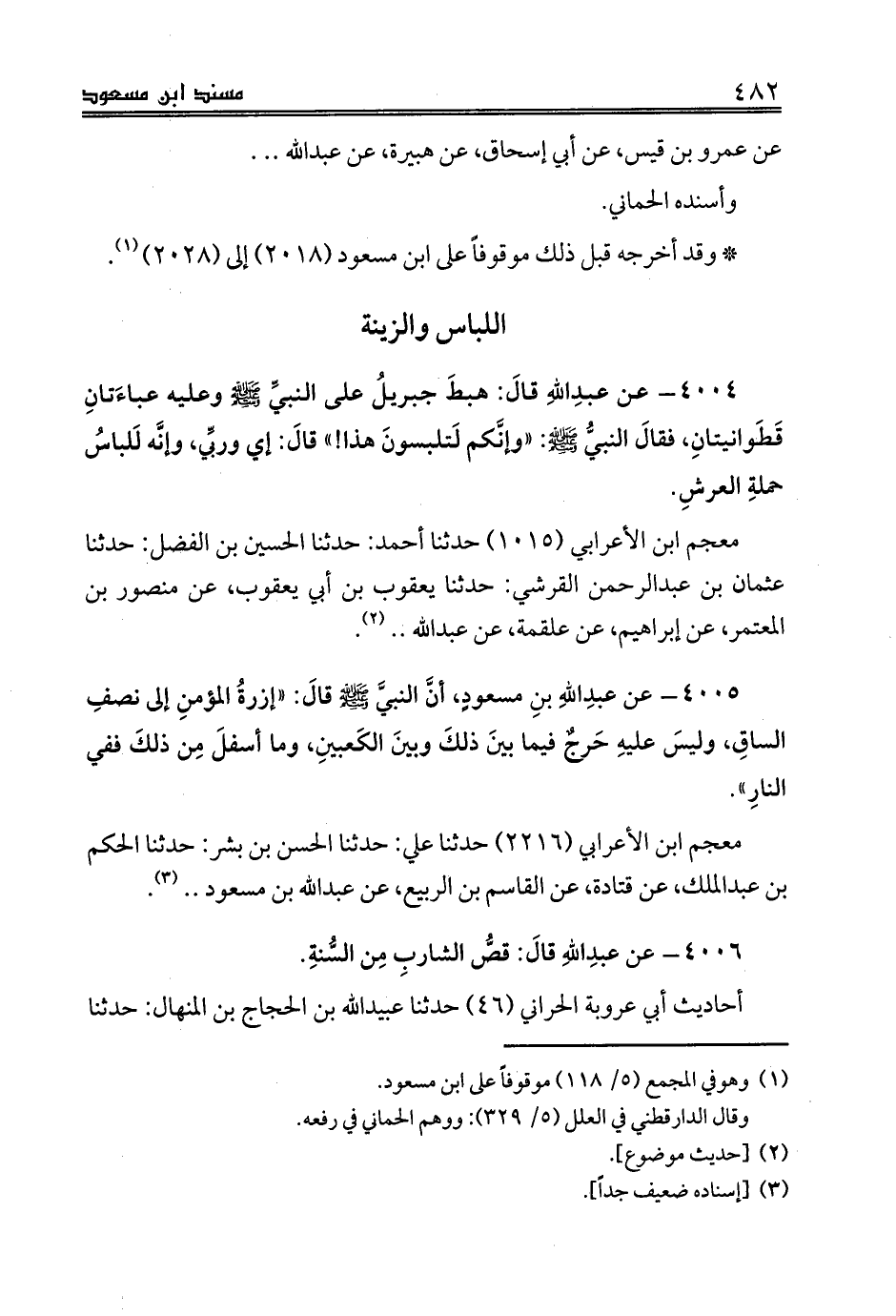 4004 - عن عبدِاللهِ قالَ: هبطَ جبريلُ على النبيِّ صلى الله عليه وسلم وعليه عباءَتانِ قَطَوانيتانِ، فقالَ النبيُّ صلى الله عليه وسلم: «وإنَّكم لَتلبسونَ هذا!» قالَ: إي وربِّي، وإنَّه لَلباسُ حملةِ العرشِ.