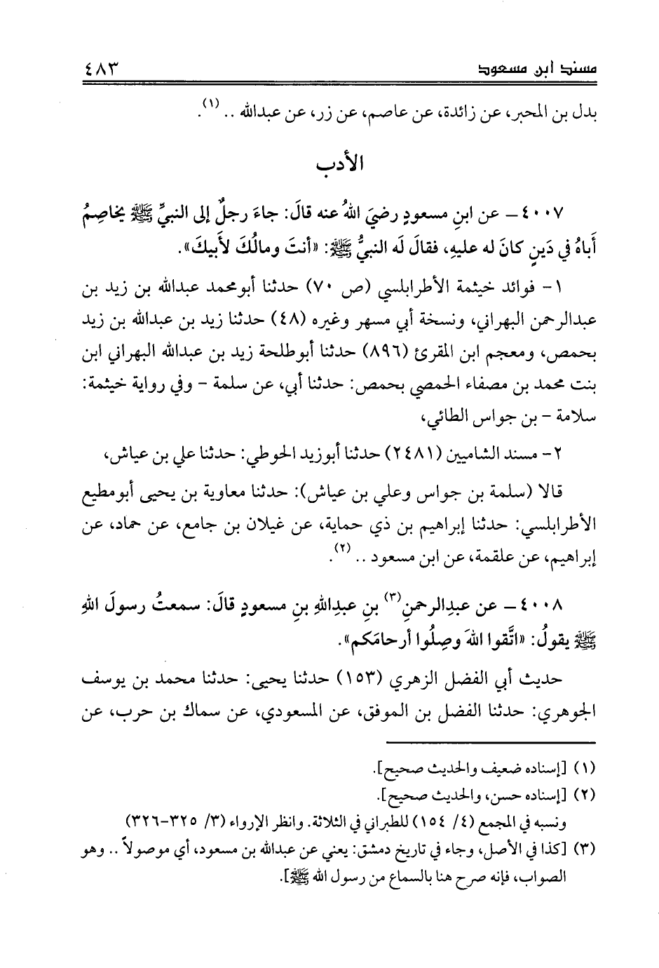 4008 - عن عبدِالرحمنِ (¬3) بنِ عبدِاللهِ بنِ مسعودٍ قالَ: سمعتُ رسولَ اللهِ صلى الله عليه وسلم يقولُ: «اتَّقوا اللهَ وصِلُوا أرحامَكم».