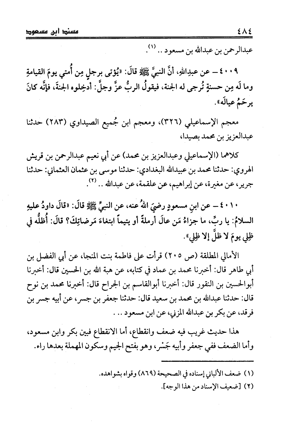 الأمالي المطلقة (ص 205) قرأت على فاطمة بنت المنجا، عن أبي الفضل بن أبي طاهر قال: أخبرنا محمد بن عماد في كتابه، عن هبة الله بن الحسين قال: أخبرنا أبوالحسين بن النقور قال: أخبرنا أبوالقاسم بن الجراح قال: أخبرنا محمد بن نوح قال: حدثنا عبدالله بن محمد بن سعيد قال: حدثنا جعفر بن جسر، عن أبيه جسر بن فرقد، عن بكر بن عبدالله المزني، عن ابن مسعود .. .