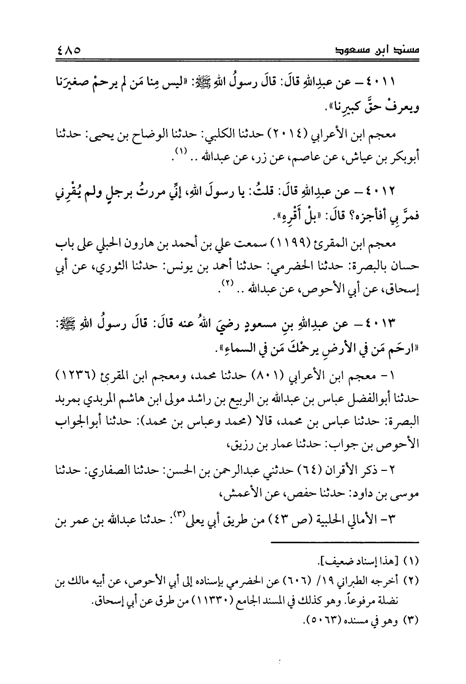 4011 - عن عبدِاللهِ قالَ: قالَ رسولُ اللهِ صلى الله عليه وسلم: «ليس مِنا مَن لم يرحمْ صغيرَنا ويعرفْ حقَّ كبيرِنا».