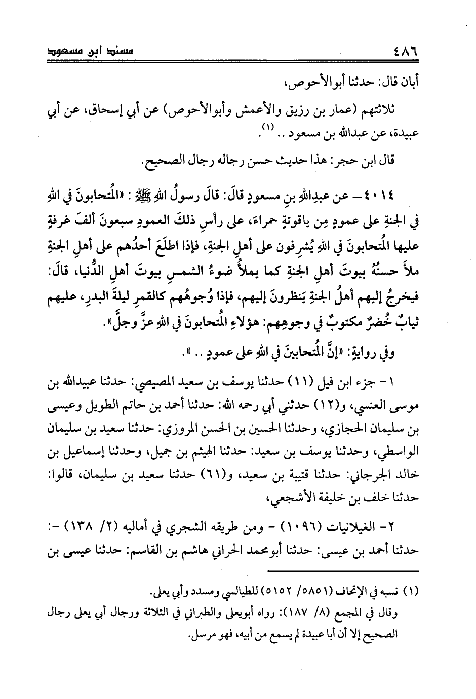 4014 - عن عبدِاللهِ بنِ مسعودٍ قالَ: قالَ رسولُ اللهِ صلى الله عليه وسلم: «المُتحابونَ في اللهِ في الجنةِ على عمودٍ مِن ياقوتةٍ حمراءَ، على رأسِ ذلكَ العمودِ سبعونَ ألفَ غرفةٍ عليها المُتحابونَ في اللهِ يُشرِفون على أهلِ الجنةِ، فإذا اطلَعَ أحدُهم على أهلِ الجنةِ ملأَ حسنُهُ بيوتَ أهلِ الجنةِ كما يملأُ ضوءُ الشمسِ بيوتَ أهلِ الدُّنيا، قالَ: فيخرجُ إليهم أهلُ الجنةِ يَنظرونَ إليهم، فإذا وُجوهُهم كالقمرِ ليلةَ البدرِ، عليهم ثيابُ خُضرٌ مكتوبٌ في وجوهِهم: هؤلاءِ المُتحابونَ في اللهِ عزَّ وجلَّ».