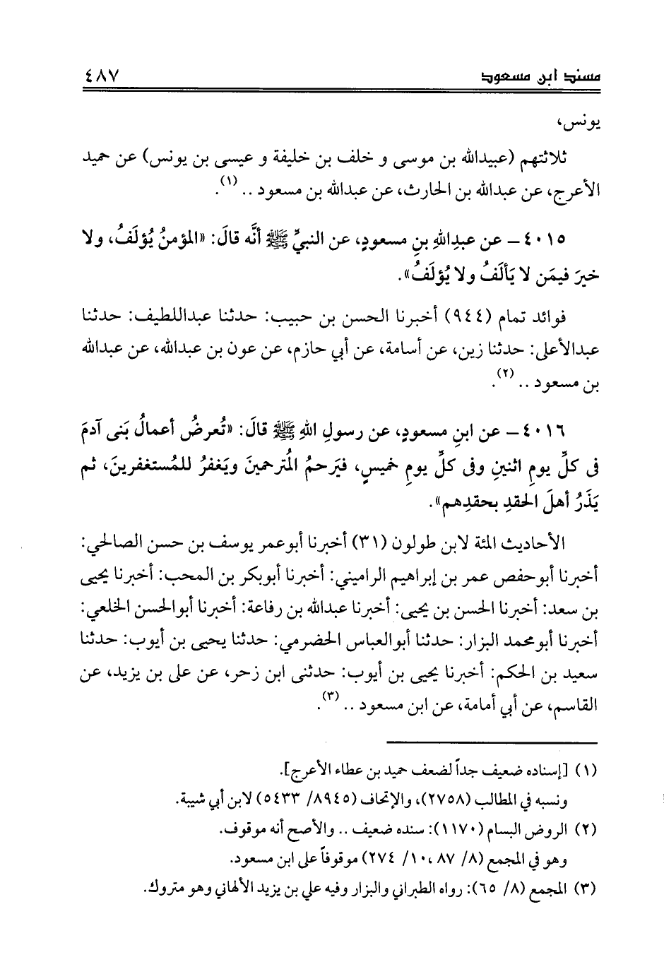 ثلاثتهم (عبيدالله بن موسى و خلف بن خليفة و عيسى بن يونس) عن حميد الأعرج، عن عبدالله بن الحارث، عن عبدالله بن مسعود .. (¬1).