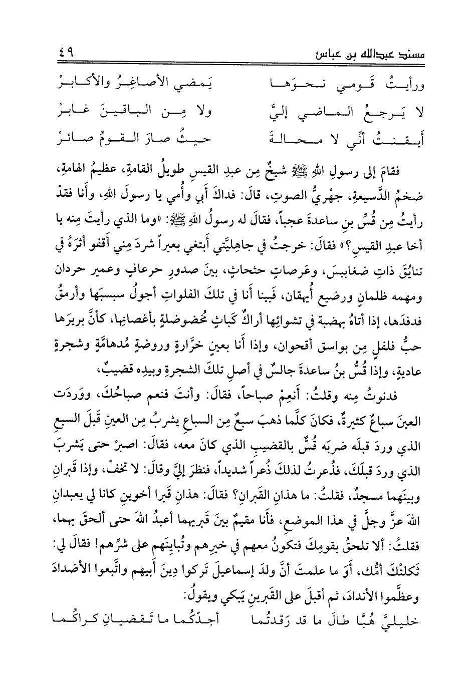 فدنوتُ مِنه وقلتُ: أَنعِمْ صباحاً، فقالَ: وأنتَ فنعم صباحُكَ، ووَردَت العينَ سباعٌ كثيرةٌ، فكانَ كلَّما ذهبَ سبعٌ مِن السباعِ يشربُ مِن العينِ قَبلَ السبعِ الذي وردَ قبلَه ضربَه قُسٌّ بالقضيبِ الذي كانَ معه، فقالَ: اصبرْ حتى يَشربَ الذي وردَ قبلَكَ، فذُعرتُ لذلكَ ذُعراً شديداً، فنظرَ إليَّ وقالَ: لا تخفْ، وإذا قَبرانِ وبينَهما مسجدٌ، فقلتُ: ما هذانِ القَبرانِ؟ فقالَ: هذانِ قَبرا أخوينِ كانا لي يعبدانِ اللهَ عزَّ وجلَّ في هذا الموضعِ، فأَنا مقيمٌ بينَ قَبريهما أعبدُ اللهَ حتى ألحقَ بهما، فقلتُ: ألا تلحقُ بقومِكَ فتكونُ معهم في خيرِهم وتُبايِنَهم على شرِّهم! فقالَ لي: ثَكلتْكَ أمُّك، أَوَ ما علمتَ أنَّ ولدَ إسماعيلَ تَركوا دِينَ أَبيهم واتَّبعوا الأضدادَ وعظَّموا الأندادَ، ثم أقبلَ على القَبرينِ يَبكي ويقولُ: