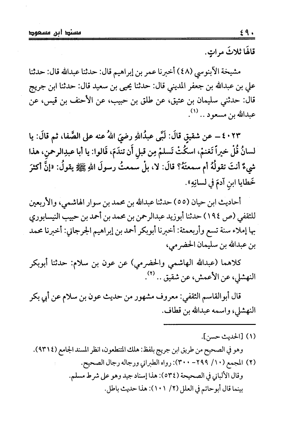 مشيخة الآبنوسي (48) أخبرنا عمر بن إبراهيم قال: حدثنا عبدالله قال: حدثنا علي بن عبدالله بن جعفر المديني قال: حدثنا يحيى بن سعيد قال: حدثنا ابن جريج قال: حدثني سليمان بن عتيق، عن طلق بن حبيب، عن الأحنف بن قيس، عن عبدالله بن مسعود .. (¬1).