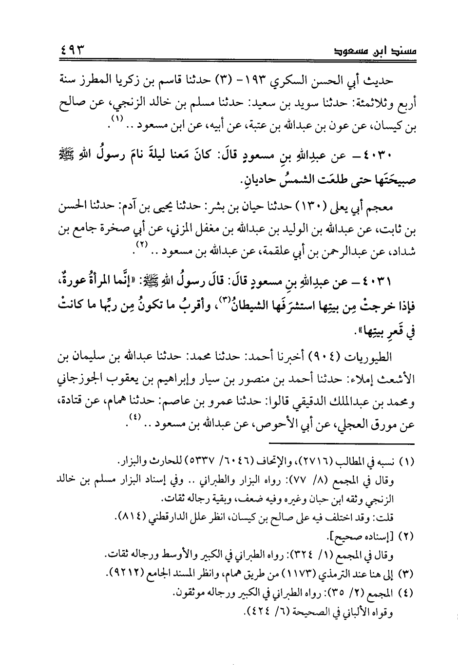 حديث أبي الحسن السكري 193 - (3) حدثنا قاسم بن زكريا المطرز سنة أربع وثلاثمئة: حدثنا سويد بن سعيد: حدثنا مسلم بن خالد الزنجي، عن صالح بن كيسان، عن عون بن عبدالله بن عتبة، عن أبيه، عن ابن مسعود .. (¬1).