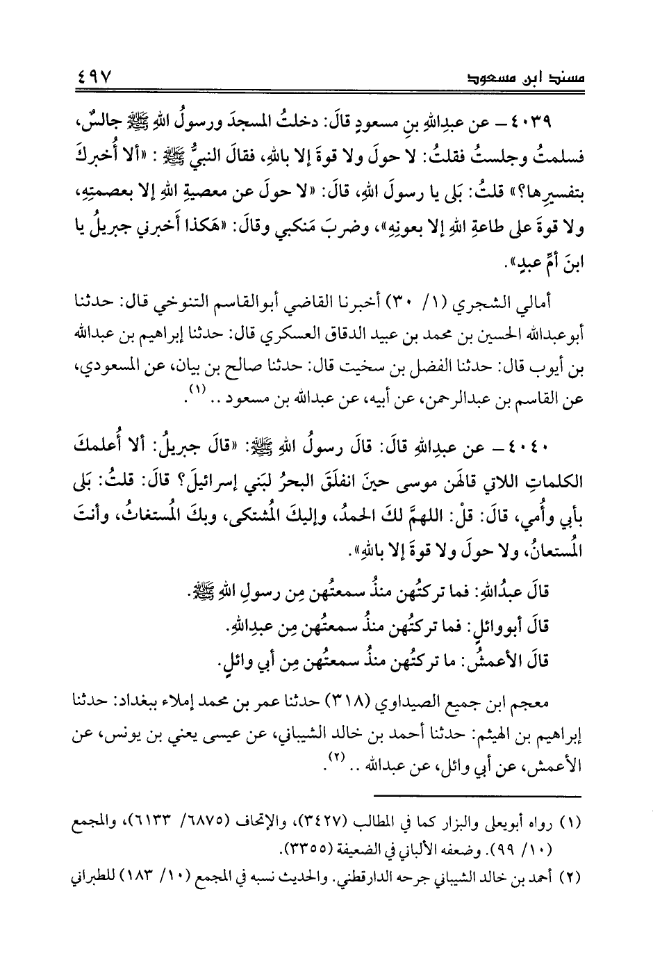 4039 - عن عبدِاللهِ بنِ مسعودٍ قالَ: دخلتُ المسجدَ ورسولُ اللهِ صلى الله عليه وسلم جالسٌ، فسلمتُ وجلستُ فقلتُ: لا حولَ ولا قوةَ إلا باللهِ، فقالَ النبيُّ صلى الله عليه وسلم: «ألا أُخبركُ بتفسيرِها؟» قلتُ: بَلى يا رسولَ اللهِ، قالَ: «لا حولَ عن معصيةِ اللهِ إلا بعصمتِهِ، ولا قوةَ على طاعةِ اللهِ إلا بعونِهِ، وضربَ مَنكبي وقالَ: هَكذا أَخبرني جبريلُ يا ابنَ أمِّ عبدٍ».