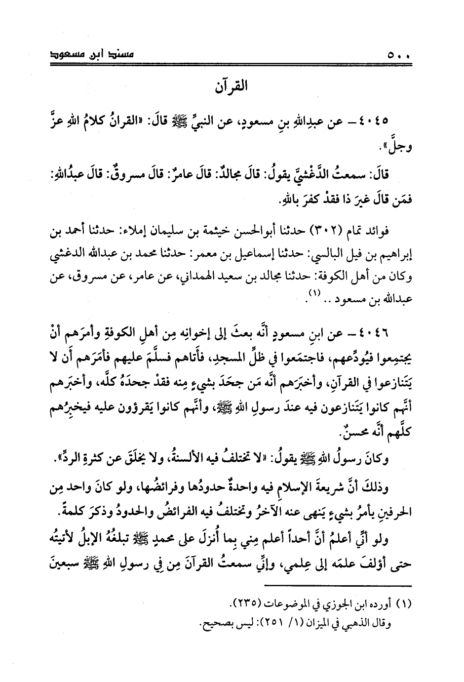 4045 - عن عبدِاللهِ بنِ مسعودٍ، عن النبيِّ صلى الله عليه وسلم قالَ: «القرانُ كلامُ اللهِ عزَّ وجلَّ».