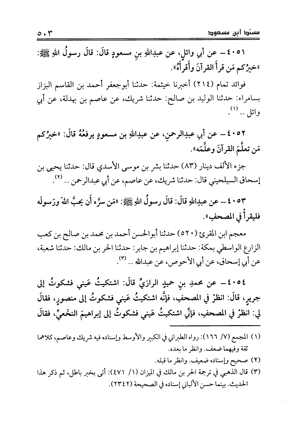 4054 - عن محمدِ بنِ حميدٍ الرازيِّ قالَ: اشتكيتُ عَيني فشكوتُ إلى جريرٍ، قالَ: انظرْ في المصحفِ، فإنَّه اشتكيتُ عَيني فشكوتُ إلى منصورٍ، فقالَ لي: انظرْ في المصحفِ، فإنَّي اشتكيتُ عَيني فشكوتُ إلى إبراهيمَ النخَعيِّ، فقالَ