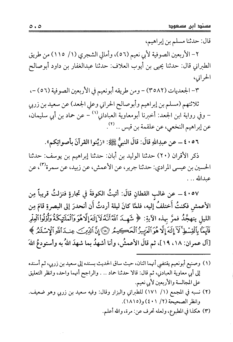 ثلاثتهم (مسلم بن إبراهيم وأبوصالح الحراني وعلي الجعد) عن سعيد بن زربي - وفي رواية ابن الجعد: أخبرنا أبومعاوية العباداني (¬1) - عن حماد بن أبي سليمان، عن إبراهيم النخعي، عن علقمة بن قيس .. (¬2).