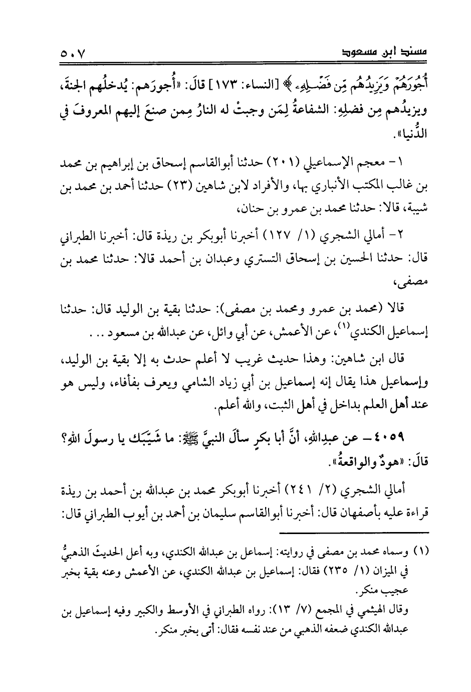 قالا (محمد بن عمرو ومحمد بن مصفى): حدثنا بقية بن الوليد قال: حدثنا إسماعيل الكندي (¬1)، عن الأعمش، عن أبي وائل، عن عبدالله بن مسعود .. .