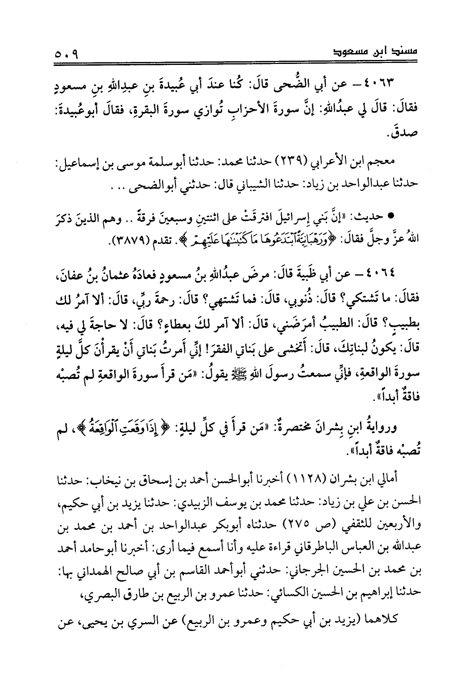 4064 - عن أبي ظَبيةَ قالَ: مرضَ عبدُاللهِ بنُ مسعودٍ فعادَهُ عثمانُ بنُ عفانَ، فقالَ: ما تَشتكي؟ قالَ: ذُنوبي، قالَ: فما تَشتهي؟ قالَ: رحمةَ ربِّي، قالَ: ألا آمرُ لك بطبيبٍ؟ قالَ: الطبيبُ أمرَضَني، قالَ: ألا آمر لكَ بعطاءٍ؟ قالَ: لا حاجةَ لي فيه، قالَ: يكونُ لبناتِكَ، قالَ: أَتخشى على بَناتي الفقرَ! إنِّي أَمرتُ بَناتي أَنْ يقرأْنَ كلَّ ليلةٍ سورةَ الواقعةِ، فإنِّي سمعتُ رسولَ اللهِ صلى الله عليه وسلم يقولُ: «مَن قرأَ سورةَ الواقعةِ لم تُصبْه فاقةٌ أبداً».
