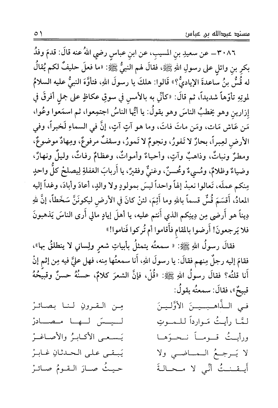 3086 - عن سعيدِ بنِ المسيبِ، عن ابنِ عباسٍ رضي اللهُ عنه قالَ: قدمَ وفدُ بكرِ بنِ وائلٍ على رسولِ اللهِ صلى الله عليه وسلم، فقالَ لهم النبيُّ صلى الله عليه وسلم: «ما فعلَ حليفٌ لكم يُقالُ له قُسُّ بنُ ساعدةَ الإياديُّ؟» قَالوا: هلكَ يا رسولَ اللهِ، فتأوَّهَ النبيُّ عليه السلامُ لموتِهِ تأوّهاً شديداً، ثم قالَ: «كأنِّي به بالأمسِ في سوقِ عكاظٍ على جملٍ أفرقَ في إِزارينِ وهو يخطبُ الناسَ وهو يقولُ: يا أيُّها الناسُ اجتمِعوا، ثم اسمَعوا وعُوا، مَن عَاش مَات، ومَن ماتَ فاتَ، وما هو آتٍ آتٍ، إنَّ في السماءِ لَخبراً، وفي الأرضِ لعِبراً، بحارٌ لا تَفورُ، ونجومٌ لا تَمورُ، وسقفٌ مرفوعٌ، ومِهادٌ موضوعٌ، ومطرٌ ونباتٌ، وذاهبٌ وآتٍ، وأحياءٌ وأمواتٌ، وعظامٌ رفاتٌ، وليلٌ ونهارٌ، وضياءٌ وظلامٌ، ومُسيءٌ ومُحسنٌ، وغنيٌّ وفقيرٌ، يا أَربابَ الغفلةِ لِيصلحْ كلُّ واحدٍ مِنكم عملَه، تَعالوا نعبدْ إلهاً واحداً ليسَ بمولودٍ ولا والدٍ، أعادَ وأبادَ، وغداً إليه المعادُ، أَقسَمَ قُسٌّ قسماً باللهِ وما أَثِمَ، لئنْ كانَ في الأرضِ ليكونَنَّ سَخَطاً، إنَّ للهِ دِيناً هو أَرضى مِن دِينِكم الذي أَنتم عليه، يا أهلَ إيادٍ مالي أَرى الناسَ يَذهبونَ فلا يَرجعونَ! أَرضوا بالمقامِ فأَقاموا أم تُركوا فَناموا!»