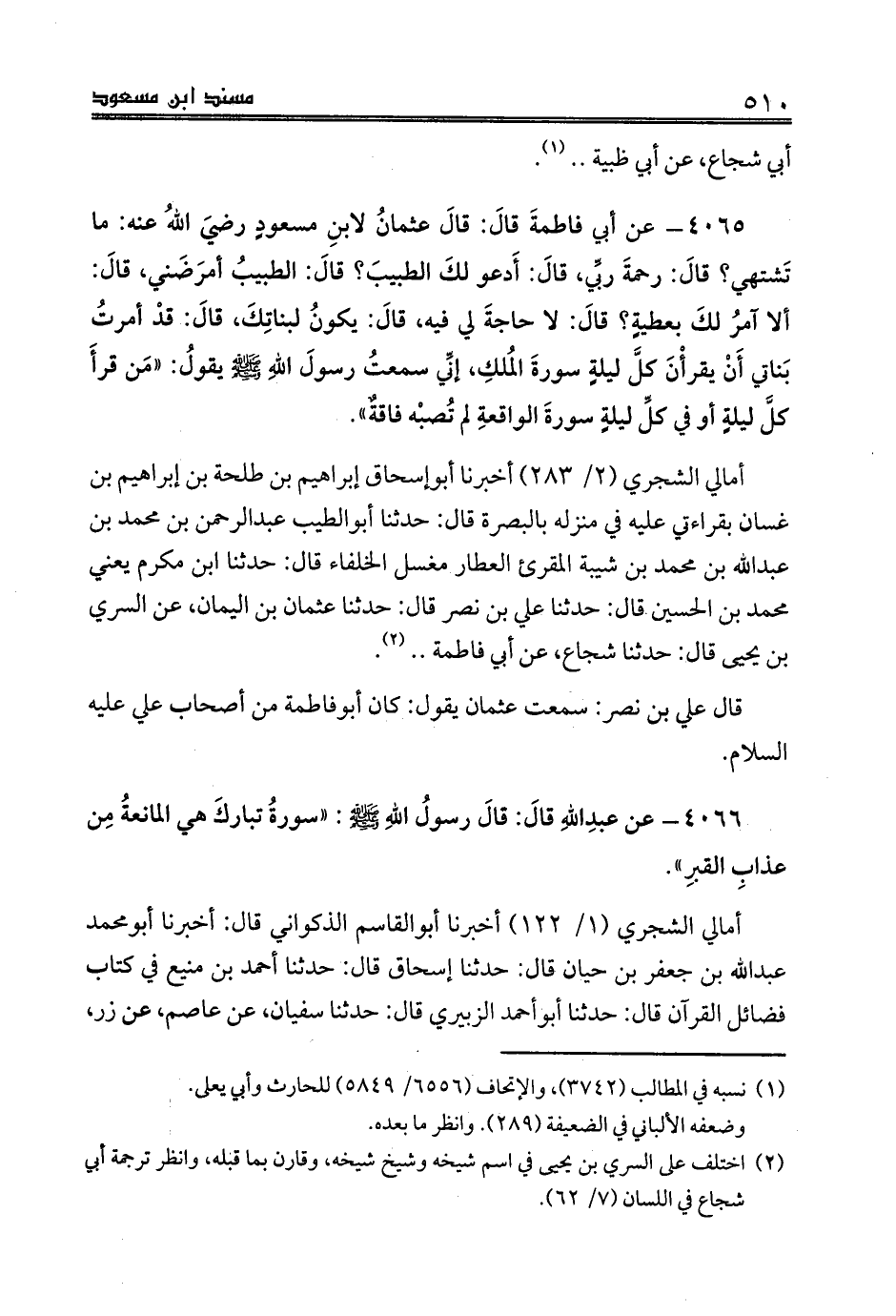 4065 - عن أبي فاطمةَ قالَ: قالَ عثمانُ لابنِ مسعودٍ رضيَ اللهُ عنه: ما تَشتهي؟ قالَ: رحمةَ ربِّي، قالَ: أَدعو لكَ الطبيبَ؟ قالَ: الطبيبُ أمرَضَني، قالَ: ألا آمرُ لكَ بعطيةٍ؟ قالَ: لا حاجةَ لي فيه، قالَ: يكونُ لبناتِكَ، قالَ: قدْ أمرتُ بَناتي أَنْ يقرأْنَ كلَّ ليلةٍ سورةَ المُلكِ، إنِّي سمعتُ رسولَ اللهِ صلى الله عليه وسلم يقولُ: «مَن قرأَ كلَّ ليلةٍ أو في كلِّ ليلةٍ سورةَ الواقعةِ لم تُصبْه فاقةٌ».