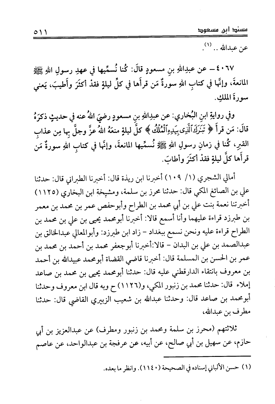 4067 - عن عبدِاللهِ بنِ مسعودٍ قالَ: كُنا نُسمِّيها في عهدِ رسولِ اللهِ صلى الله عليه وسلم المانعةَ، وإنَّها في كتابِ اللهِ سورةٌ مَن قرأَها في كلِّ ليلةٍ فقدْ أكثَرَ وأَطيبَ، يَعني سورةَ الملكِ.