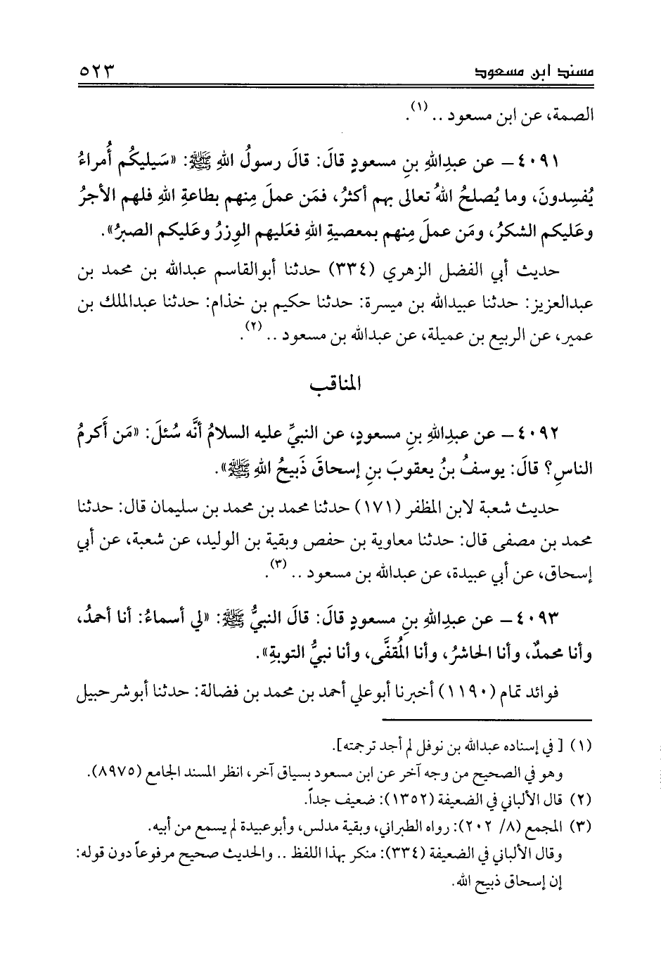 4093 - عن عبدِاللهِ بنِ مسعودٍ قالَ: قالَ النبيُّ صلى الله عليه وسلم: «لي أسماءُ: أنا أحمدُ، وأنا محمدٌ، وأنا الحاشرُ، وأنا المُقفَّى، وأنا نبيُّ التوبةِ».