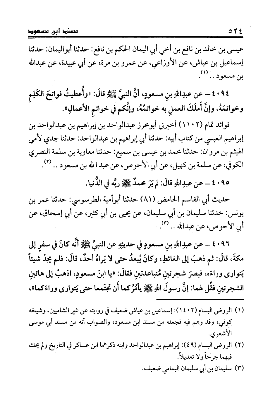 (¬1) الروض البسام (1402): إسماعيل بن عياش ضعيف في روايته عن غير الشاميين، وشيخه كوفي، وقد وهم فيه فجعله من مسند ابن مسعود، والصواب أنه من مسند أبي موسى الأشعري.