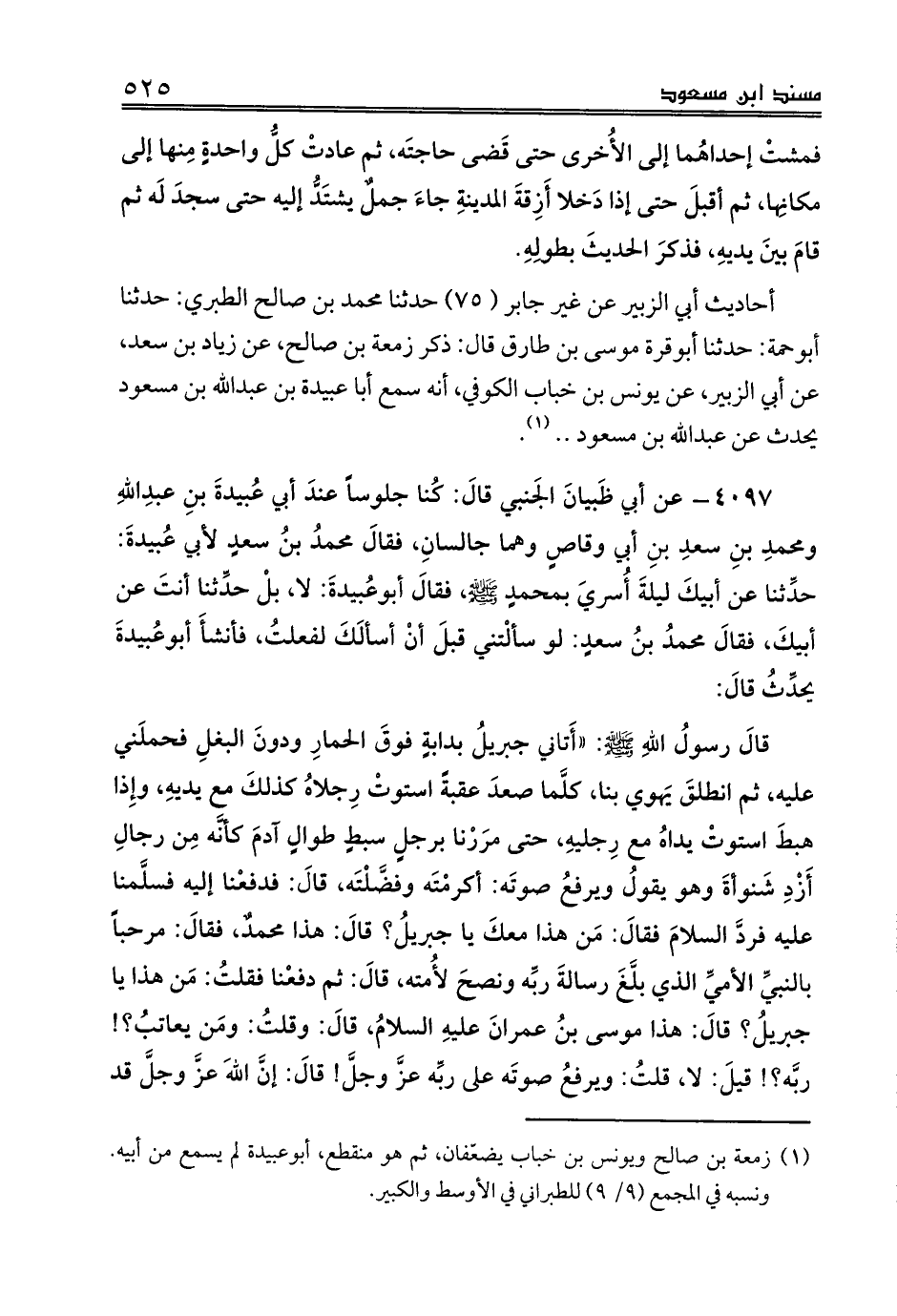 4097 - عن أبي ظَبيانَ الجَنبي قالَ: كُنا جلوساً عندَ أبي عُبيدةَ بنِ عبدِاللهِ ومحمدِ بنِ سعدِ بنِ أبي وقاصٍ وهما جالسانِ، فقالَ محمدُ بنُ سعدٍ لأبي عُبيدةَ: حدِّثنا عن أبيكَ ليلةَ أُسريَ بمحمدٍ صلى الله عليه وسلم، فقالَ أبوعُبيدةَ: لا، بلْ حدِّثنا أنتَ عن أبيكَ، فقالَ محمدُ بنُ سعدٍ: لو سألْتني قبلَ أنْ أسألَكَ لفعلتُ، فأنشأَ أبوعُبيدةَ يحدِّثُ قالَ: