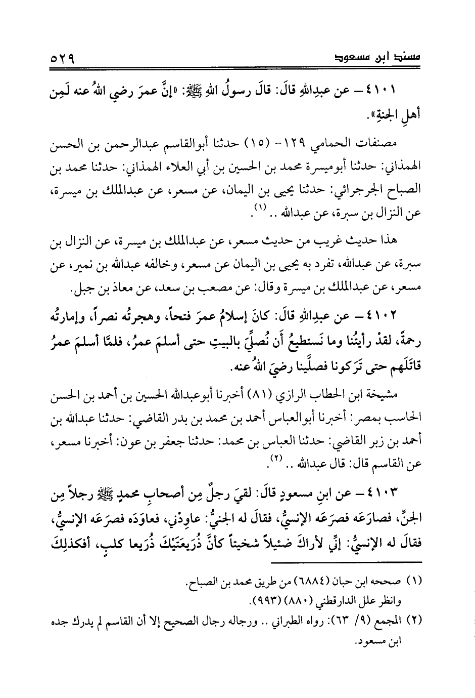 مصنفات الحمامي 129 - (15) حدثنا أبوالقاسم عبدالرحمن بن الحسن الهمذاني: حدثنا أبوميسرة محمد بن الحسين بن أبي العلاء الهمذاني: حدثنا محمد بن الصباح الجرجرائي: حدثنا يحيى بن اليمان، عن مسعر، عن عبدالملك بن ميسرة، عن النزال بن سبرة، عن عبدالله .. (¬1).