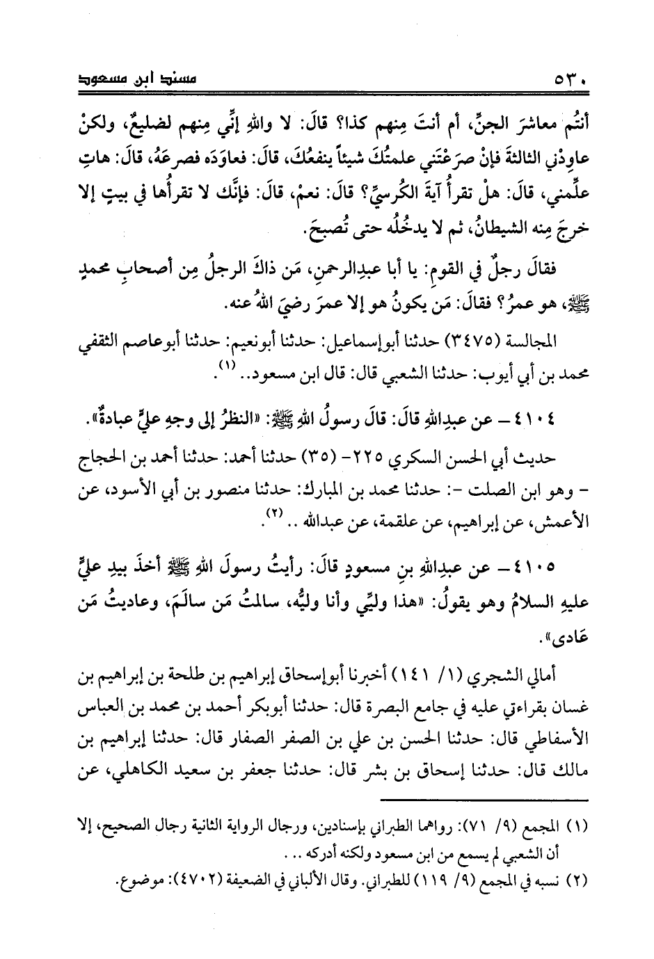 (¬1) المجمع (9/ 71): رواهما الطبراني بإسنادين، ورجال الرواية الثانية رجال الصحيح، إلا أن الشعبي لم يسمع من ابن مسعود ولكنه أدركه .. .