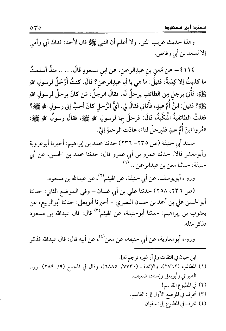 (ص 236، 258) حدثنا علي بن أبي غسان – وفي الموضع الثاني: حدثنا أبوالحسن علي بن أحمد بن حسان البصري - أخبرنا أبويعلى: حدثنا أبوالربيع، عن يعقوب بن إبراهيم: حدثنا أبوحنيفة، عن الهيثم (¬3) قال: قال عبدالله بن مسعود فذكر مثله.