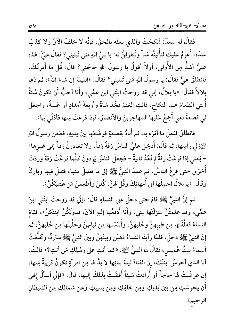 فقالَ له سعدٌ: أَنكحَكَ والذي بعثَه بالحقِّ، فإنِّه لا خلفَ الآنَ ولا كذبَ عندَه، أَعزمُ عليكَ لتأْتينَّه غداً ولَتقولنَّ له: يا نبيَّ اللهِ متى تَبنيني؟ فقالَ عليٌّ: هَذه عليَّ أشدُّ مِن الأُولى، أولاً أقولُ يا رسولَ اللهِ حاجَتي؟ قالَ: قُل ما أَمرتُكَ، فانطلَقَ عليٌّ فقالَ: يا رسولَ اللهِ مَتى تَبنيني؟ فقالَ: «الليلةَ إِن شاءَ اللهُ»، ثم دَعا بلالاً فقالَ: «يا بلالُ، إني قد زوجتُ ابنَتي ابنَ عمِّي، وأَنا أحبُّ أَن تكونَ سُنةُ أُمتي الطعامَ عندَ النكاحِ، فائتِ الغنمَ فخُذ شاةً وأربعةَ أمدادٍ أو خمسةً، واجعَل لي قصعةً لعليٍّ أَجمعُ عَليها المهاجرينَ والأنصارَ، فإذا فرغتَ مِنها فآذنِّي بها».