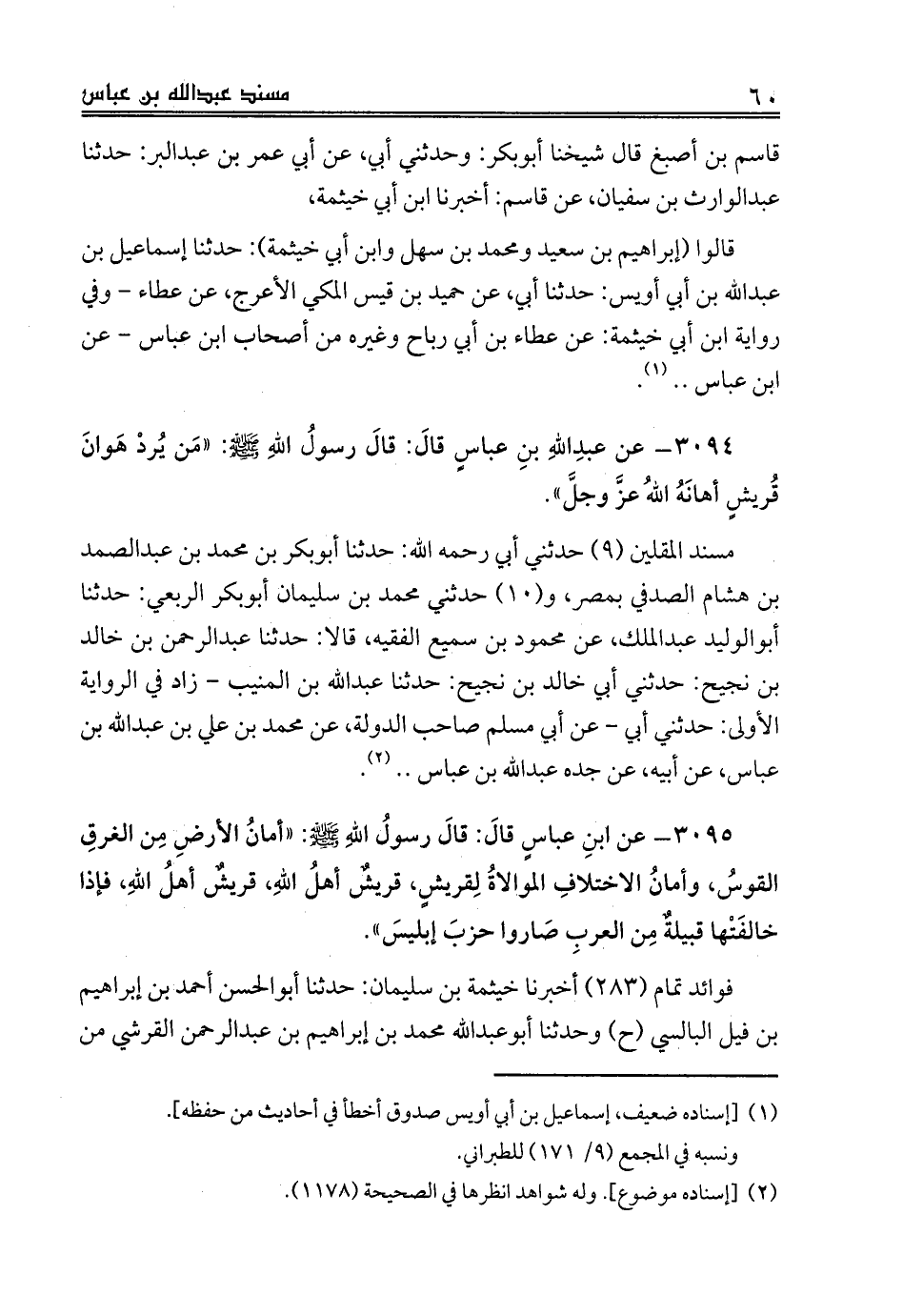 مسند المقلين (9) حدثني أبي رحمه الله: حدثنا أبوبكر بن محمد بن عبدالصمد بن هشام الصدفي بمصر، و (10) حدثني محمد بن سليمان أبوبكر الربعي: حدثنا أبوالوليد عبدالملك، عن محمود بن سميع الفقيه، قالا: حدثنا عبدالرحمن بن خالد بن نجيح: حدثني أبي خالد بن نجيح: حدثنا عبدالله بن المنيب - زاد في الرواية الأولى: حدثني أبي - عن أبي مسلم صاحب الدولة، عن محمد بن علي بن عبدالله بن عباس، عن أبيه، عن جده عبدالله بن عباس .. (¬2).