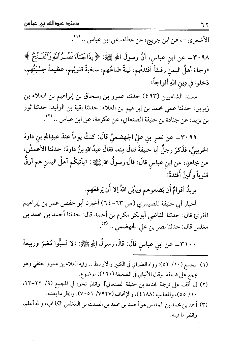 3099 - عن نصرِ بنِ عليٍّ الجهضميِّ قالَ: كنتُ يوماً عندَ عبدِاللهِ بنِ داودَ الخريبيِّ، فذَكرَ رجلٌ أبا حنيفةَ فنالَ مِنه، فقالَ عبدُاللهِ بنُ داودَ: حدثنا الأعمشُ، عن مجاهدٍ، عن ابنِ عباسٍ قالَ: قالَ رسولُ اللهِ صلى الله عليه وسلم: «يأتيكُم أهلُ اليمنِ هم أرقُّ قلوباً وأَلينُ أَفئدةً».