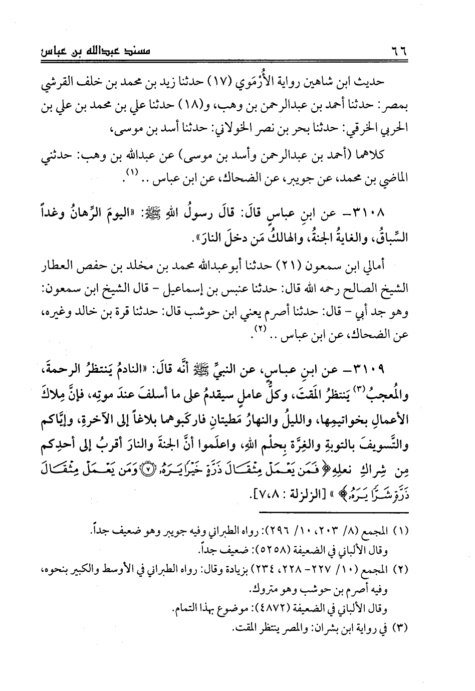 كلاهما (أحمد بن عبدالرحمن وأسد بن موسى) عن عبدالله بن وهب: حدثني الماضي بن محمد، عن جويبر، عن الضحاك، عن ابن عباس .. (¬1).